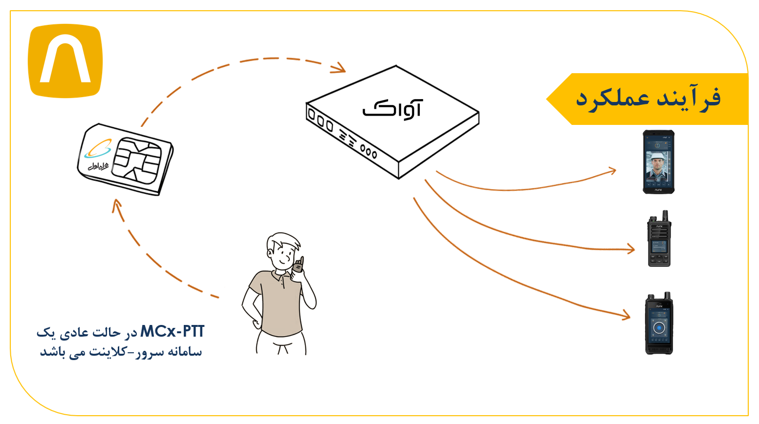 MCx-PTT در حالت عادی یک سامانه سرور-کلاینت می باشد.